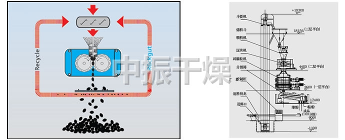 对辊式挤压造粒的工艺原理是:干物料在压力作用下团聚成致密坚硬的大块(饼料),称为挤压过程;饼料再被破碎筛分后成为颗粒料称为造粒过程。挤压的作用一是将颗粒间的空气挤掉,另外是使颗粒间距达到足够近,以产生如范德华力、吸附力、晶桥及内嵌连接等吸引力。挤压造粒的颗粒主要是靠分子之间的作用力形成的颗粒强度。