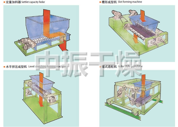 ◎水平挤出成型机: 由加料斗、二根辊子和U形振动网构成。以增大物料的表面积为目的,造粒物料与振动网接触,由旋转辊子的强制压力挤出网外,形成圆柱形的颗粒。
