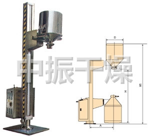 TJG 系列固定提升加料机由两部分组成,即提升机及底座。提升机由机架、液压提升系统及料门翻转机构组成。工作时,先将提升机的料门与料桶扣合,启动提升操作杆,料门与料桶一起上升,启动翻转操作杆,料桶即可番转180度,呈底桶向上姿态并移动到所需位置,利用料门上出料蝶阀,可很容易将物料加入所需的工艺设备中。